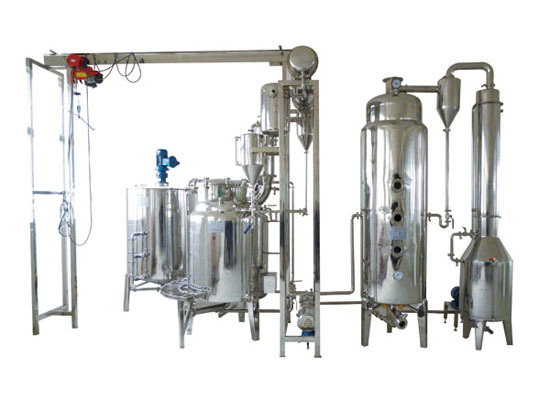 濃縮:提取罐內(nèi)的溶媒加熱至沸騰30-50分鐘關(guān)停電加熱器,強制循環(huán)泵繼續(xù)強制循環(huán),使溶媒溫度降至90度時開啟真空泵進行濃縮,濃縮時產(chǎn)生的蒸氣經(jīng)冷凝器變成水進入浦集器,此時關(guān)停循環(huán)泵繼續(xù)濃縮至所需濃度時放出濃縮液進行第二次提取濃縮。