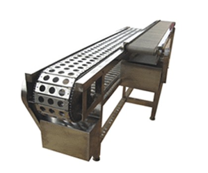 板塊式輸送機是將冰淇淋外包裝盒裝放在輸送機板塊孔內(nèi),使其口面向上整齊的緩慢向前輸送,其速度和冰淇淋機的速度相吻合,除此之外也可用作輸送其他物品。